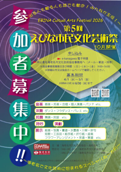 〒243-0438 海老名市めぐみ町6番1号 海老名市文化会館内(大ホール棟1F) TEL:046-240-8870 / FAX:046-259-7860