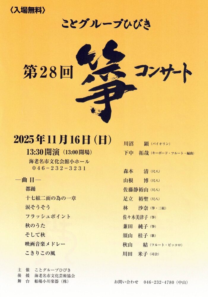 音楽 箏コンサート 主催者 ことグループひびき 開催日 2025年11月16日(日) 会 場 海老名市文化会館 小ホール 時 間 13:30~ 【入場料等】入場無料 【問 合 せ】TEL:090-9974-6329(中山)