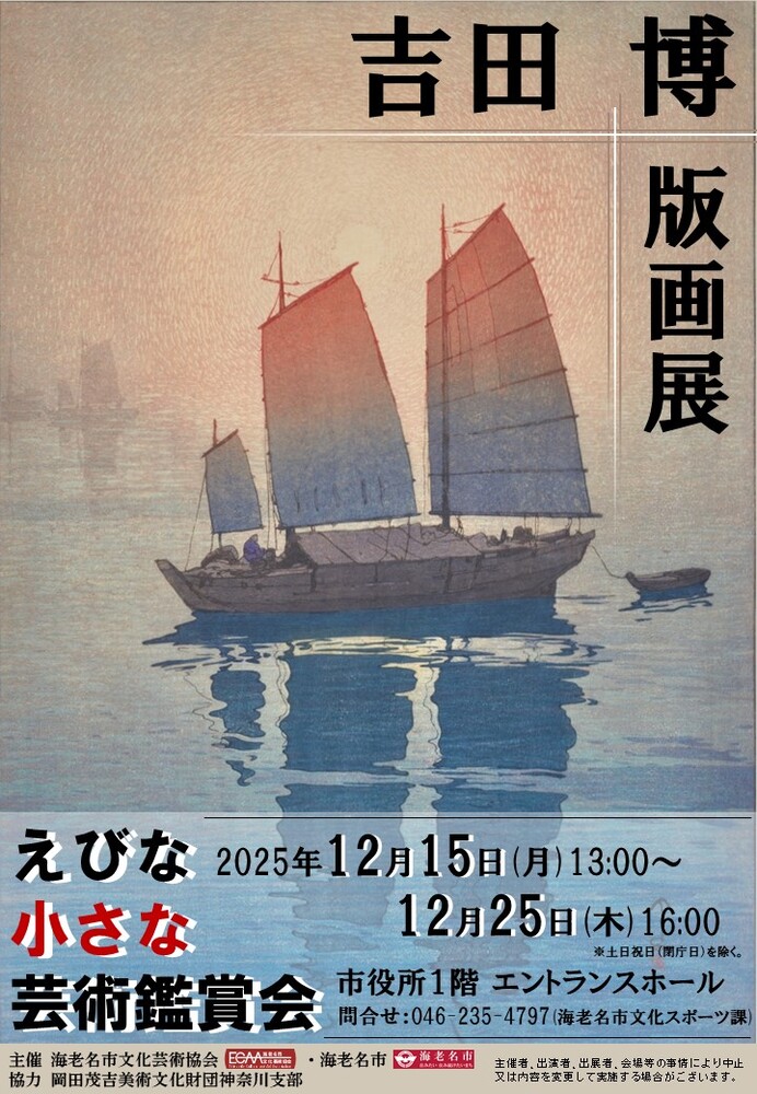 音楽、展示、舞台など様々なジャンルの芸術鑑賞機会を展開する「えびな小さな芸術鑑賞会」。今年度2回目は海老名市役所1階エントランスホールを会場に、明治~昭和にかけて活動していた吉田博の「帆船」全シリーズ含む15点の版画作品の展示を行います!