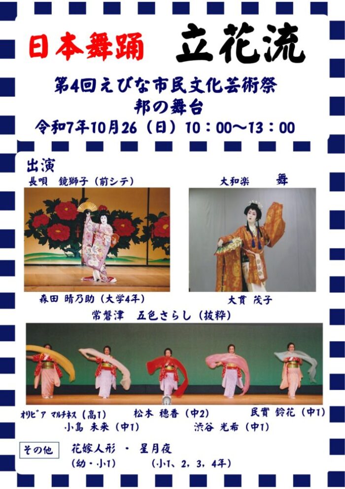 舞台部門 日本舞踊部 宗家 立花流 活動日時 毎週火曜日 17時〜19時 連絡先 立花志津千穂 090-1840-5808 日本の伝統芸能である古典舞踊です 小学生、中学生、小学生親子、(一般) 日本の歴史上の人物や出来事を踊りで表現します たとえば、扇の的(まと)、白虎隊、黒田武士、弁慶、牛若丸、 童謡、お習い事、お姫様など 一般(高校生、大学生、大人年齢不問) 長唄の古典曲